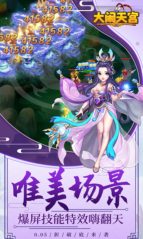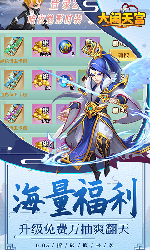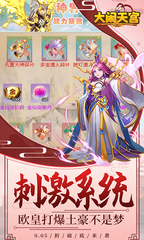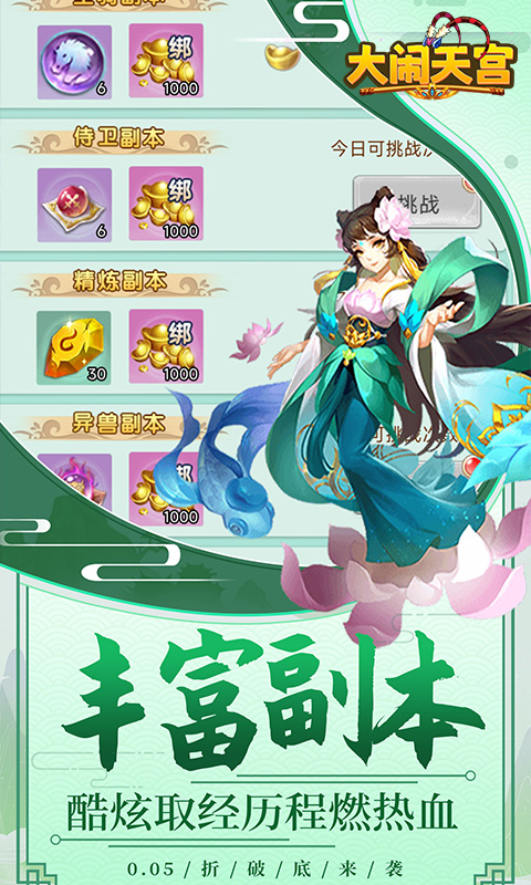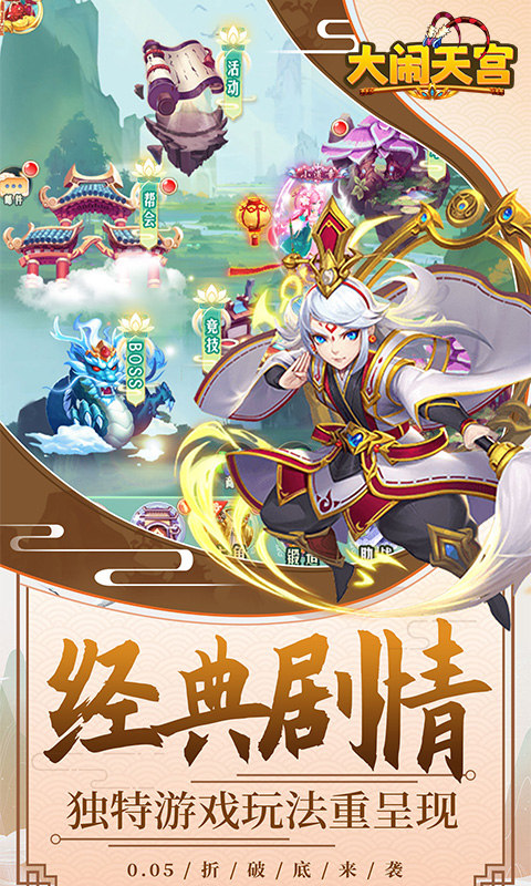 《大闹天宫(永久0.05折)》是一款Q版回合制游戏。开局就送VIP10、SSSSR侍卫·姜子牙、元宝*100000、绑元*1000000!精美2DQ版人物设计,搭配神话故事剧情,实力打造精品回合制经典!酷炫坐骑共同遨游三界,独有万千道具自由回收,多样经典回合玩法无穷乐趣!