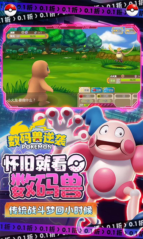 口袋妖怪系列终极力作《数码兽逆袭(0.1折怀旧宝可梦)》闪亮出场!0.1折充值福利超级大放送,没有套路超保真,价格无虚高648元真的只要6.48元!!!3D宠物带你玩转精彩精灵世界!数百种口袋宝贝藏于地图中等你搜集,捕捉、培养、进化。游戏100%还原经典场景、经典音效,感官盛宴陪你找回童年快乐回忆!剧情闯关、竞技PK、精灵联盟试炼等丰富特色玩法等你来挑战!