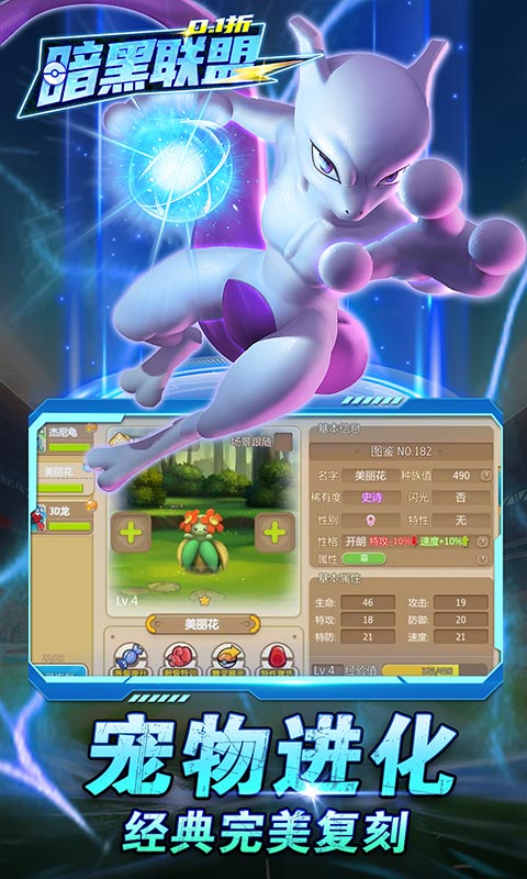 暗黑联盟(0.1折帕鲁超进化)精灵养成RPG手游,全球亿万口袋妖怪迷一致首选!100%重制原著剧情,再现精灵大师炼成之路!数百款萌宠精灵等你捕捉收集、精心养成,最强精灵无限进化!经典怀旧的对战模式,属性相克实力PK,顶级特效完美展现精灵技能释放!全球亿万口袋妖怪迷一致首选!二次元宠物RPG手游横空出世,带你走进精灵的世界!游戏集宠物收集、养成、进化于一体,涵盖经典剧情过关、竞技场PK、副本挑战等多样玩法
